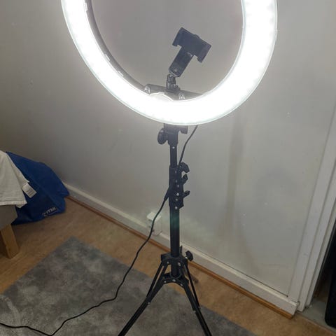 Ringlight. Toimii kuin pitää. Kosmeettisia vaurioita kun joutui kerran koiranpennun hampaisiin. Eivät vaikuta käyttöön. Valoa käytetty vähän eli ledit toimii erittäin hyvin. Säilytys kassi mukana.