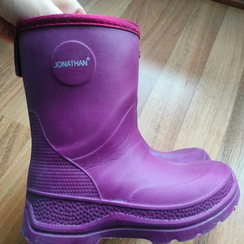 Jonathanin lasten kumisaappaat tytöille, koko 25. Väriltään hieman tummempi kuin kuvassa. Saappaissa on korkea varsi ja kuvioitu pohja, joka antaa pitoa liukkaalla alustalla. Erittäin kevyet. Yhdellä lapsella käytetty.