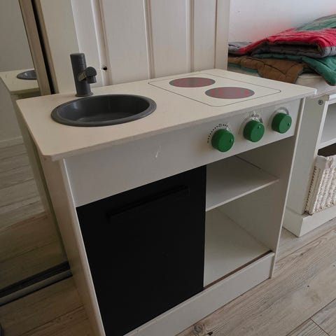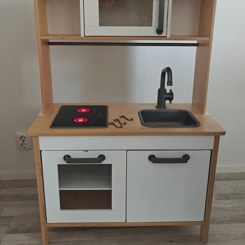 HobbyHall leikkikeittiö lapsille. Vaaleanpunainen leikkikeittiö, jossa on liesitaso, hana ja pyöreä tiskiallas. Yläosassa tanko keittiövälineiden ripustamiseen ja koukut tarvikkeille. Alhaalla avohyllyt ja kaappitila leikkiruuille ja astioille. Soveltuu lasten leikkeihin sisätiloissa. Ovi vaan on irronut ja mennyt rikki.