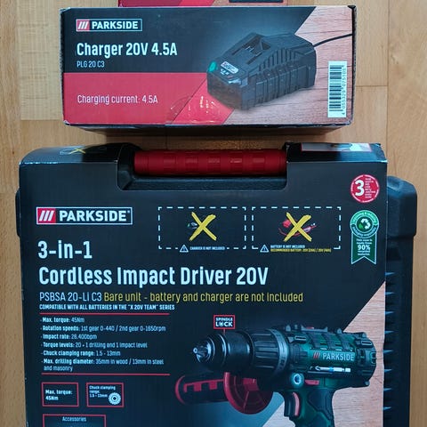 Parkside PABSS 3,6 Li ruuvinväännin / akkuporakone. Mukana muovinen säilytyslaukku, laturi sekä useita erikokoisia poranteriä ja ruuvauskärkiä. Soveltuu kevyisiin ruuvaus- ja poraustöihin kotikäytössä.