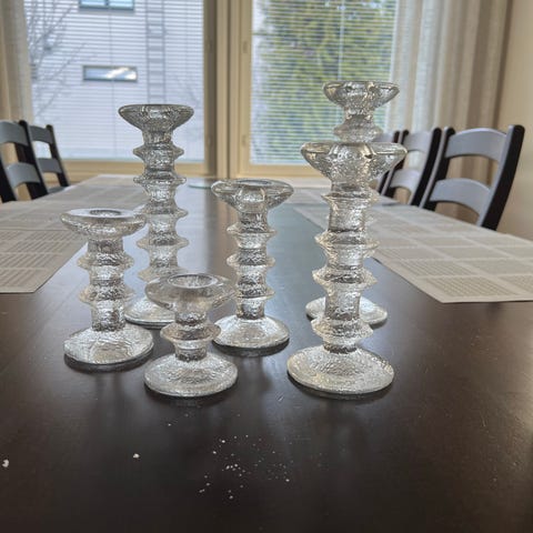 Iittala Festivo kynttilänjalat settinä. Sis. 7-6-4-3-, 2kpl 2-solmuista sekä 1-solmuisen. Hyväkuntoiset, kaikissa tarrat. Nouto Kälviältä tai sovitaan mahd.postitus.