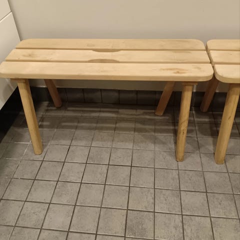 Jyskistä hankitut penkit, 2 kpl, joissa puinen runko ja vaalea punottu istuinosa. Istuinosassa on leveistä nauhoista tehty ruutukuvioinen punos. Penkissä on alhaalla poikkipuut, jotka tukevat rakennetta ja voivat toimia myös kevyenä säilytystasona esimerkiksi kengille tai koreille. Sopii käytettäväksi eteisessä, makuuhuoneessa, kylpyhuoneessa tai muussa oleskelutilassa lisäistuimena tai laskutasona.