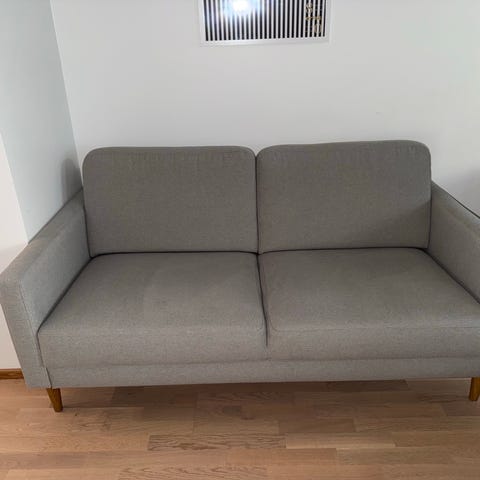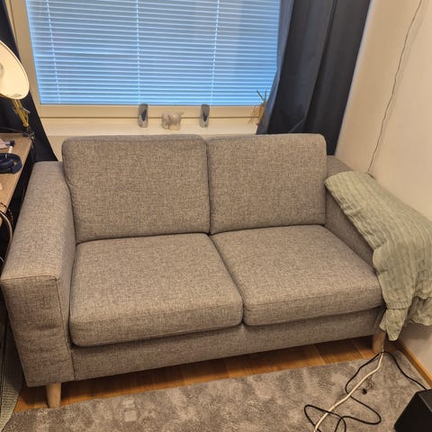 Vaalean värinen kahden istuttava sohva. Ostettu vuosi sitten. Ollut eläintaloudessa mutta istuinosa suojattu viltillä. Imuroitu, ei tahroja. Vain nouto.