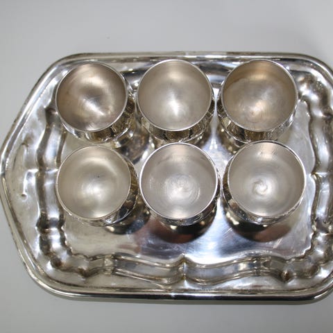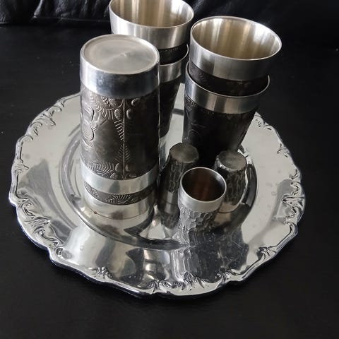 hopeiset snapsilasit tarjottimella /Ei Ikea!