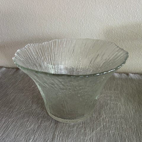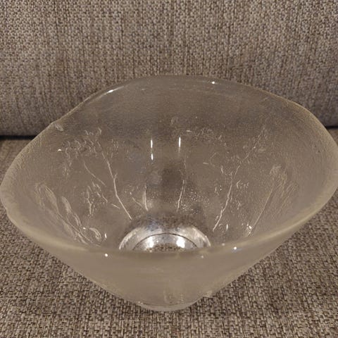 Läpinäkyvä lasikulho, jossa mattapintainen, hiekkapuhalletun oloinen pinta ja kaiverrettuja kasviaiheisia kuvioita kyljissä. Kulhossa on pyöristetty, hieman epäsymmetrinen yläreuna ja selkeä jalustaosa. Sopii esimerkiksi tarjoilukulhoksi tai sisustusesineeksi. Koko ja tilavuus eivät käy ilmi kuvista, joten ne kannattaa tarvittaessa mitata erikseen.