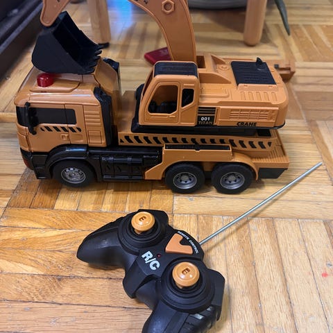 Hyväkuntoinen kauko-ohjattava kaivuri sisä- tai ulkoleikkeihin, toimii paristoilla. Yksittäinen koristepiuha irronnut.