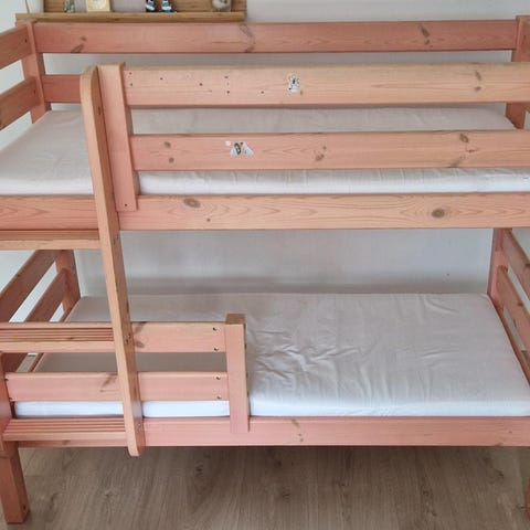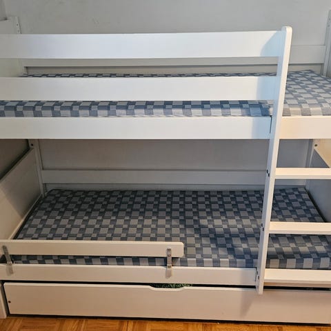 IKEA Svärta kerrossänky valkoista metallia. Sängyssä on metalliritiläpohjat molemmilla tasoilla ja integroidut turvakaiteet yläpedillä. Päädyssä on kiinteä tikas ylös kiipeämistä varten. 90 cm x 200 cm.