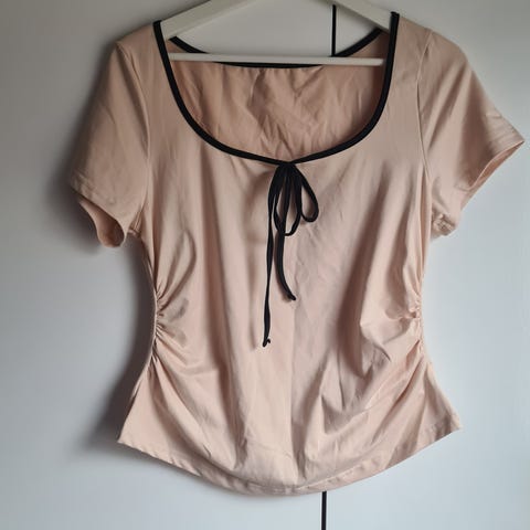 Naisten paita, koko XL. Materiaali on 100 % polyesteriä, jossa on samettimainen, kiiltävä pinta. Väri on vaalea beige. Paidassa on pitkät hihat ja pyöreä pääntie. Hihansuissa on rypytys ja kuminauha. Sopii arki- ja juhlakäyttöön. Huolto-ohjeet pesulapussa: konepesu samankaltaisten kanssa, ei valkaisua, silitys ja rumpukuivaus ohjeiden mukaan.