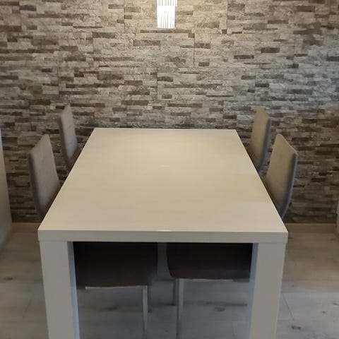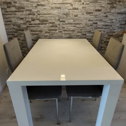 Pöydän päälle teetetty lasi. Lasia käytetty heti alusta alkaen, joten pöydän pinta kuin uusi lasin alla.
