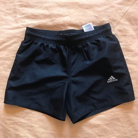 Adidas poikien shortsit, koko 140. Väri musta, sivuilla valkoiset raidat ja lahkeessa punainen Adidas-logo. Materiaali polyesteriä. Sopivat arki- ja urheilukäyttöön.