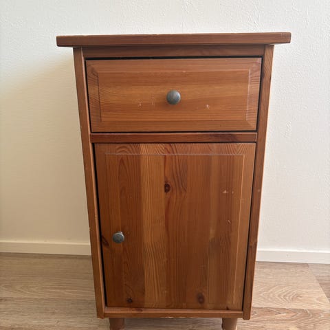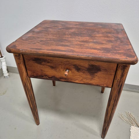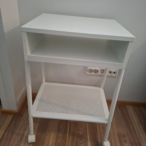 Pieni musta hylly tai sivupöytä. Reunoissa ja kulmissa vähän kulumisen jälkiä.