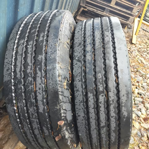 Myydään 3kpl renkaita. Yksi uusi pinnoitettu ja kaksi sileää vanteella. Sopii ilmeisesti perävaunuun sekä scanian etupyöräksi