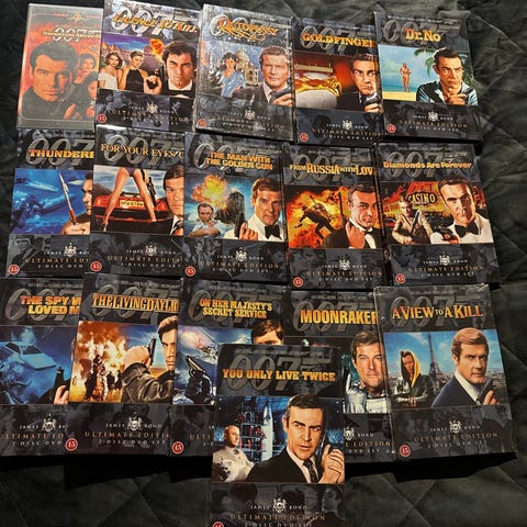James Bond 007 Collectors Edition -DVD-boksi. Kokoelma sisältää useita James Bond -elokuvia yhtenäisessä laatikossa. Pakkauksessa on listattuna elokuvien nimet, kuten esimerkiksi Dr. Moonraker, For Your Eyes Only, Octopussy, A View to a Kill, The Living Daylights, Licence to Kill, GoldenEye, Tomorrow Never Dies, The World Is Not Enough, Die Another Day, Casino Royale ja Quantum of Solace. Formaatti on DVD.