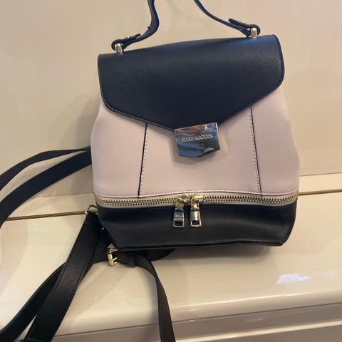 Steve Madden käsilaukku naisille, valmistettu mustasta tekonahasta. Laukussa on kantokahvat sekä säädettävä ja irrotettava olkahihna. Ulkopinnassa on tikattu kuviointi ja kullanväriset metalliyksityiskohdat. Laukussa on useita vetoketjullisia osastoja ja sisätaskuja pienten tavaroiden säilytykseen. Soveltuu arkilaukuksi ja työ- tai opiskelukäyttöön esimerkiksi asiakirjojen ja pienten tarvikkeiden kuljettamiseen. Koko 25*35