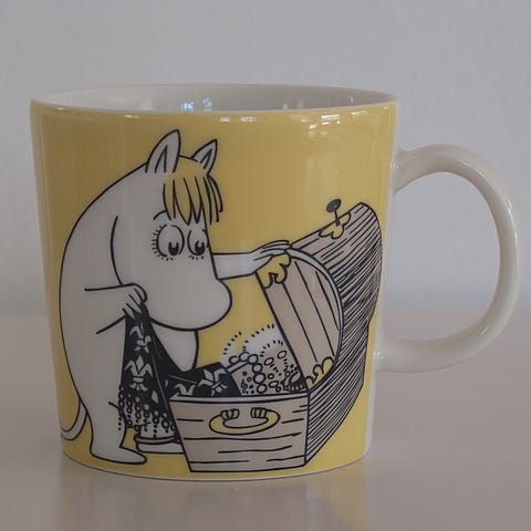Keltainen Niiskuneiti, Arabian Muumimuki. Ollut käytössä lyhyen aikaa, hyvä kunto, muttei uudenveroinen.