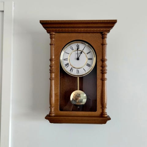 Valkoinen lattiakellon runko, materiaalina puu. Kellosta puuttuvat koneisto, viisarit ja lasit, joten kyseessä on pelkkä kuori tai runko-osa. Muotoilultaan perinteinen, ylä- ja alaosassa koristeellisia yksityiskohtia. Soveltuu esimerkiksi kunnostusprojektiin tai sisustuselementiksi ilman toimivaa kellomekanismia.