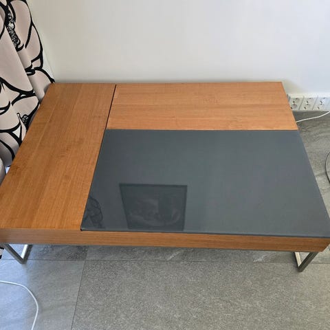 Hyvä kuntoinen sohvapöytä. Helppo siirrellä koska pyörät alla. Kivasti säilytystilaa. Mitat löytyy yhdestä kuvasta.