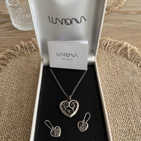 Lumoava hopea korusetti, johon kuuluu sydänriipuksella varustettu kaulakoru ja sydänkorvakorut. Materiaalina on hopea. Korut toimitetaan Lumoavan rasiassa kuvien mukaisesti. Korut ovat uusia ja käyttämättömiä. Korujen leveys 1,5 cm.