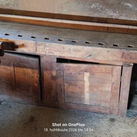 Puinen puusepän työpöytä, jossa massiivipuinen runko ja taso.