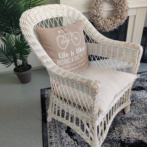 Rottinkituoli, jossa istuinosassa on vajoama ja selkänojassa on muutama rottinki poikki