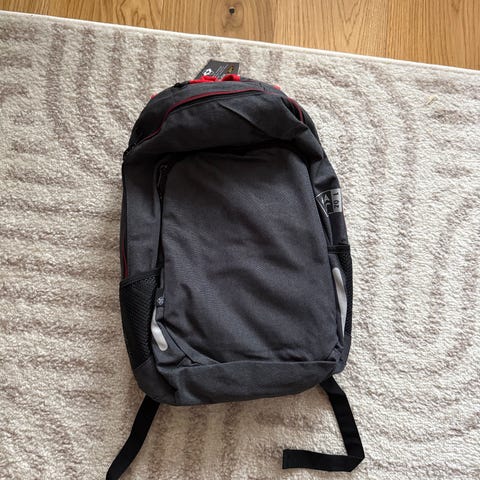 Db merkkinen reppu, verkkokaupasta ostettu. Kätevä sivuaukaisu.