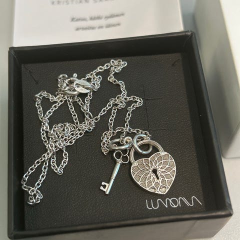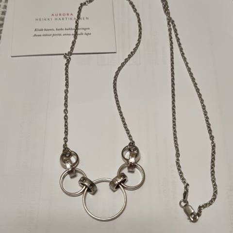 Lumoava kaulakoru naisille. Kaulakorussa on hopeinen ketju ja pyöreä riipus, jossa on rengasmainen osa ja sen päällä erillinen koristeosa. Materiaalina on hopea. Korussa on jousirengaslukko. Ketju 42/45cm. Löytyy leima 925.