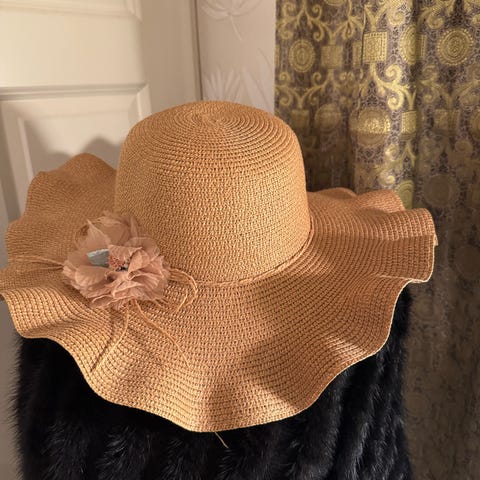Myydään siisti olkihattu, jossa musta nauha ja hillitty rusetti. Koko M/56.