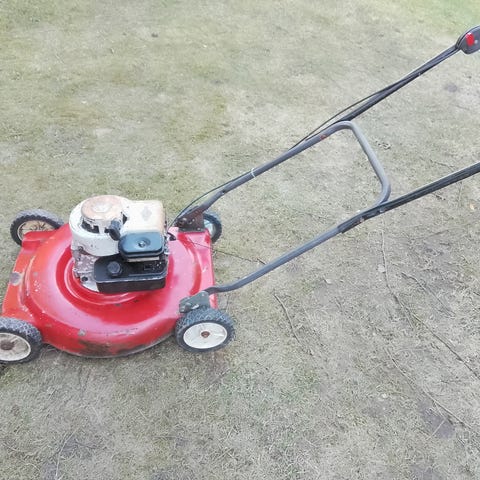 Brigss strattonin moottorilla ja partnerin kopalla oleva työnnettävä leikkuri.