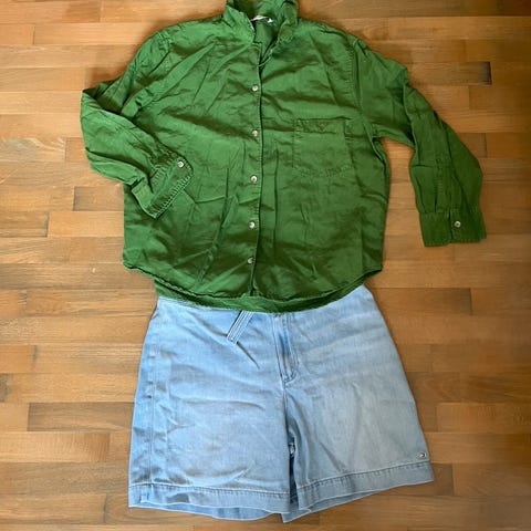 Viskoosi-pellavapaita kauniilla ruutukuosilla. 70 viskoosi, 30 pellavaa. Koko L ja on aika reilua kokoa. Helma on hauskasti epäsymmetrinen. Väri on ruskea, vihreä ja vaaleanpunainen. Paita on virheetön.