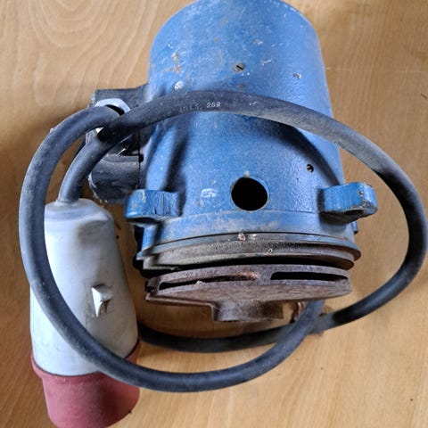 Kolmeks sähkömoottori, jossa laippakiinnitys ja erillinen kytkentäkotelo. Moottori on kolmivaiheinen ja varustettu punaisella voimavirtapistokkeella. Rungossa on tyyppikilpi teknisine arvoineen (jännite, teho, kierrosluku, suojaluokka), jotka voi tarkistaa läheltä otetusta kuvasta. Moottorissa on hihnapyörä tai vastaava voimansiirto-osa akselissa. Soveltuu esimerkiksi koneiden tai laitteiden käyttömoottoriksi, joissa tarvitaan laipallista asennustapaa ja kolmivaihevirtaa. Rungossa ja kaapelissa näkyy käytön ja ikääntymisen jälkiä.