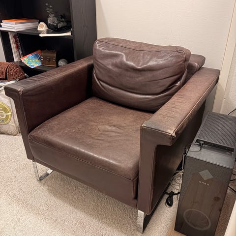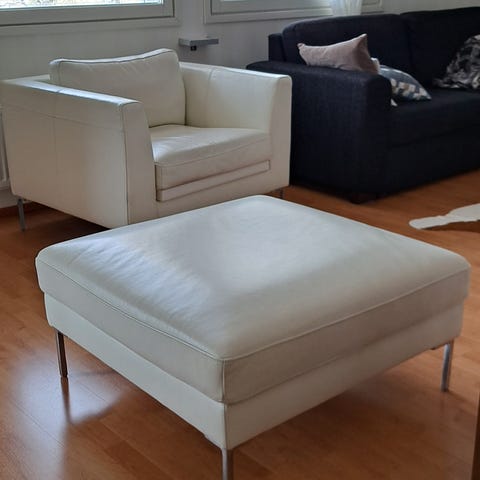 Arne Norellin suunnittelema nojatuoli, hyvässä kunnossa. Ajan tuomaa patinaa toki löytyy, pehmusteet erinomaisessa kunnossa, nahka tuolissa ehjä. Rahin päällinen kokenut elämää hieman enemmän, kuten kuvista näkee.