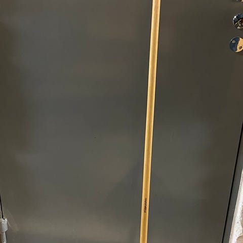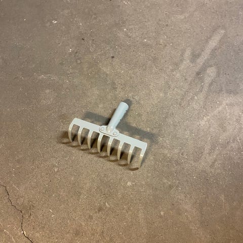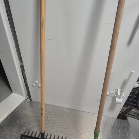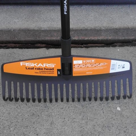 Metallinen harava, jossa puinen varsi. Haravassa on leveä metallinen piha- tai puutarhaharavan pää, joka sopii esimerkiksi lehtien ja roskien keräämiseen pihalta tai puutarhasta. Varsi on puuta ja haravan pää metallia. Kuvassa kaksi samantyyppistä haravaa.