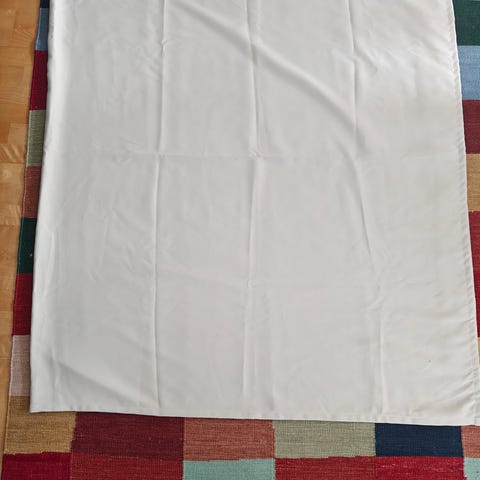 Toinen puoli beigeä/vaaleankellertävää kangasta ja nurja puoli valkoista pimentävää kangasta. Verho on itse ommeltu kankaasta. Yläosassa muovinen tukiosa, verhossa ei ole itsessään kiinnitystä eli tarvitsee verhokoukut.
