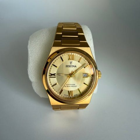 Festina kello. Käytetty muutama kerta ja ostettu 11/2024 vielä on 2 vuoden takuuta jäljellä. Ei vikoja. Kellon OVH on 249€ uutena. Mukana kaikki toimitetut paperit kuten takuutodistus. Hieno hopealoisto kellon taulussa, jota ei voi tallentaa kuvaan ja näkyy eri tavalla eri valaistusolosuhteissa. Kellon kultaus on tehty sähkökultaustekniikalla, joka tekee kellon rungosta kestävämmän viiltoja ja osumia vastaan. Sopii hyvin pieniin ja suuriin miesten ranteisiin sekä eri etäisyyksille kämmenen juuresta säädettävän remmin takia.