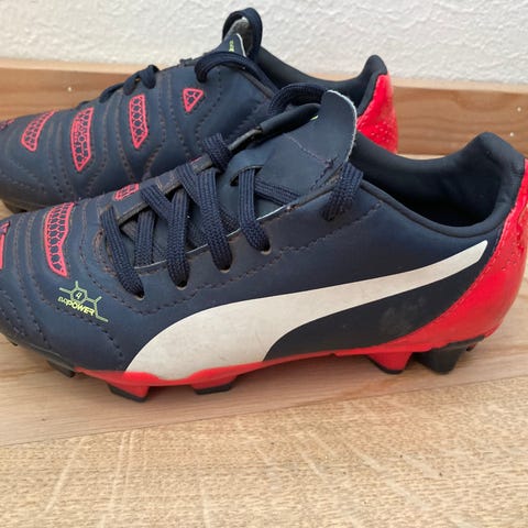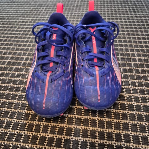 Puma jalkapallokengät, koko 31, väriltään valkoinen ja pinkki. Kengissä on nappulapohjat nurmikenttäkäyttöön. Mukana mustat säärisuojat, jotka kiinnittyvät jalkaan tarranauhalla.