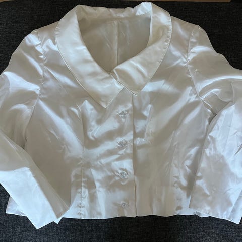 Juhlava, kiiltäväpintainen satiinimekko, jossa runsaasti laskoksia ja kerroksellinen helma. Yläosa on olkaimeton ja vyötäröllä on leveä, laskostettu vyömäinen osa. Materiaalina sileä satiinikangas, jonka alla on tukirakennetta antava vuorikangas. Sopii esimerkiksi juhla- tai iltapuvuksi.
