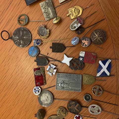 Kokoelma kultasävyisiä kuninkaallisia rintamerkkejä ja neuloja. Settiin kuuluu useita eri kokoisia ja -muotoisia merkkejä, joissa on kruunu- ja monogrammiaiheita sekä joitakin ristiaiheisia ja ankkuriaiheisia merkkejä. Osa merkeistä on neulakiinnitteisiä, osa perinteisiä rintaneuloja. Sopii esimerkiksi Hyväkuntoiset Hinta YHTEENSÄ 25€keräilyyn,