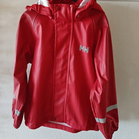 Hans company sadetakki, koko 116. Hyväkuntoinen. Käytön jälkiä näkyy sisäpuolella (värimuutoksia, kuvassa) ja heijastinnauhat kuluneet.