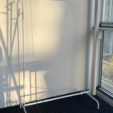 Matta musta, metallia. Saa tarvittaessa purettua kasaan. Toimii myös loistavasti hengarien avulla pyykinkuivaustelineenä tai rekkinä.