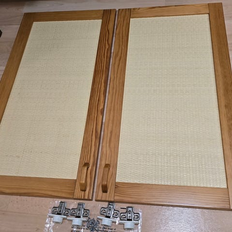 Valkoinen taustalevy ja valkoiset sivut sekä ovien keskiosat. Muut osat puun värisiä.
