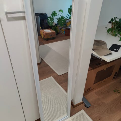 Mustakehyksinen suorakulmainen peili, joka soveltuu kokovartalopeiliksi tai vaakasuoraan seinälle kiinnitettäväksi. Peilissä on kapea, tumma kehys ja se sopii esimerkiksi makuuhuoneeseen tai eteiseen sisustuspeiliksi.