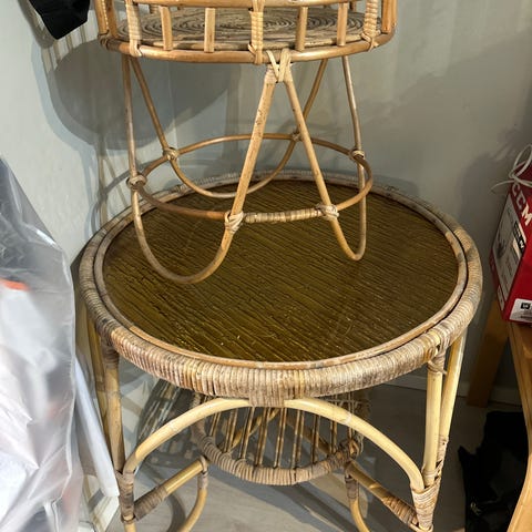 4 kpl korkealla selkänojalla, kokonaiskorkeus 104cm ja puukauluksella olevat rottinkituolit.