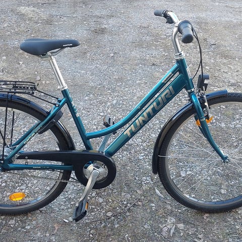 Tunturi lasten polkupyörä, jossa 26" renkaat. Shimano Nexus vaihteet, 7 vaihdetta. Pyörässä on musta runko violetilla kuvioinnilla, täyspitkät lokasuojat, tavarateline takana sekä seisontatuki. Ohjaustangossa on käsijarru ja soittokello. Renkaissa hyvin pintaa. Käyttöohje- ja huoltokirja. Ostokuitti löytyy mutta takuu ei enää voimassa. Kahdet avaimet.