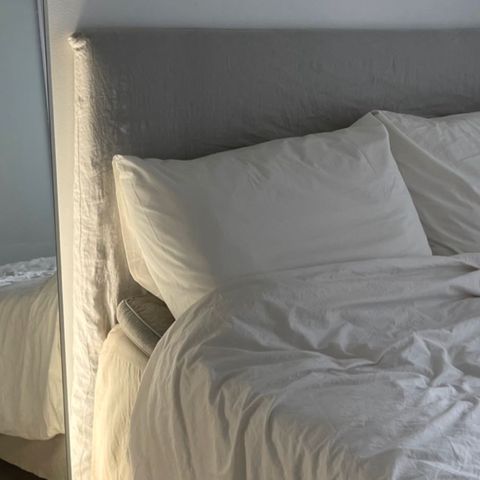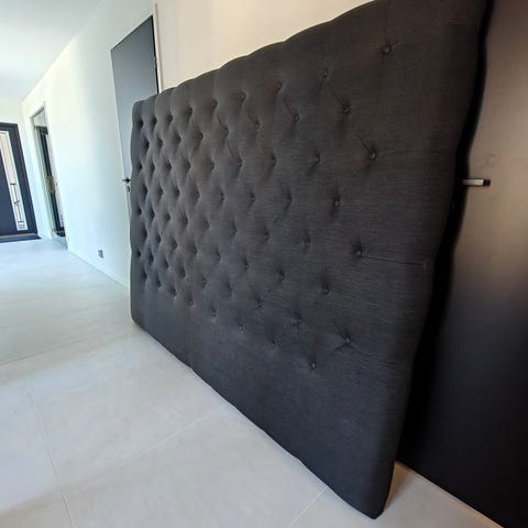 Harmaa sängynpääty. Käytetty 160cm leveän sängyn kanssa, sängynpäädyn korkeus 125cm.