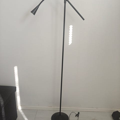 Lattiavalaisin/ jalkalamppu kahdella lampulla. Ylhäällä on lamppu joka valaisee ylöspäin ja keskellä spottivalo jonka voi kääntää tarvitsemaansa asentoon. Molemmat toimii ja lamput saa mukaan. Ylävaloon on myös voimakkuuden säätö.