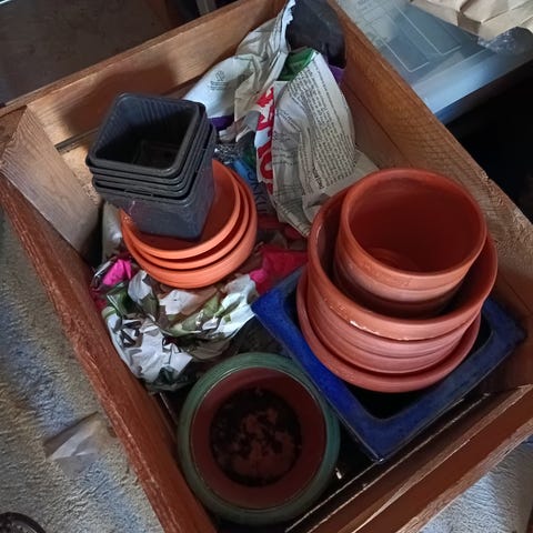 Myydään sekalainen setti puutarhatarvikkeita pakettina. Mukana isompia ja pienempiä kukkapurkkeja / -ruukkuja, lautasia, parvekelaatikoita ja tukiraudat ainakin osalle.