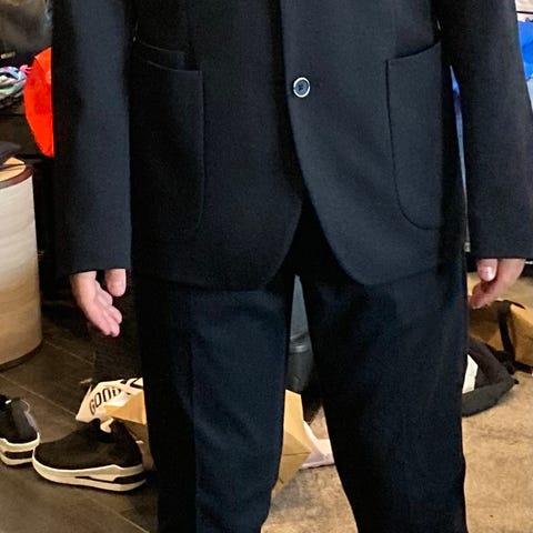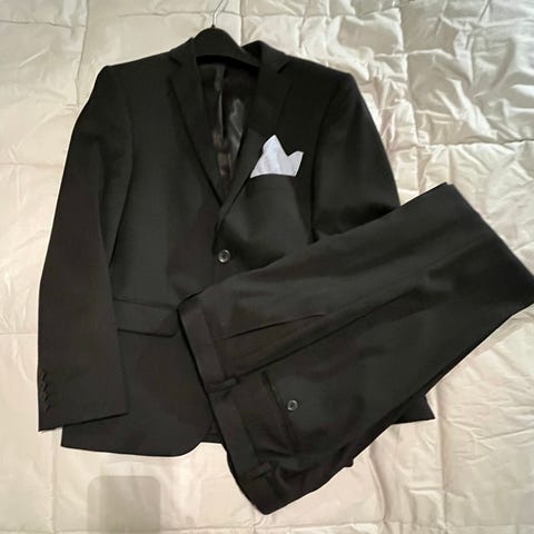Erittäin hyväkuntoinen musta puku. Sopii rippipuvuksi tai muuten. Takin koko 42, short, slim fit, housut W28, L30.