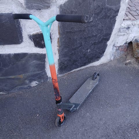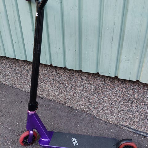 Slamm Scooters temppupotkulauta. Skuutissa on käytön jälkeä, mutta toimii erinomaisesti. Pyörät rullaavat kevyesti, hyväkuntoinen dekkigrippi SKATEPRO-logolla. T-mallinen ohjaustanko ja käsigripit hyväkuntoiset. Takana jarru.