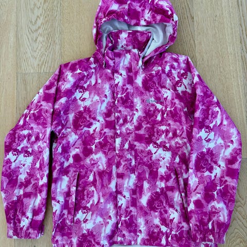 Vaaleanpunainen ohut tuulitakki viininpunaisella etuosalla. Taskuissa nepparit. Hieman tummentumaa hihan suissa. Ei näy kuvissa, kun yritin kuvata.