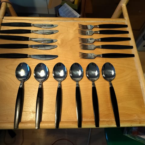 Myydään aterimet. Lusikoita, haarukoita ja veitsiä on jokaista kuusi kappaletta.
